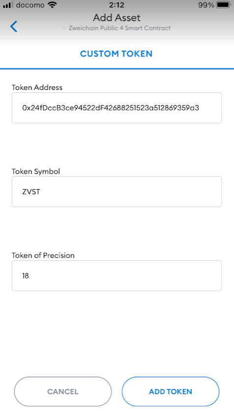 After pasted the token address, the token symbol “ZVST” and Token of Precision “18” will be automatically filled in.